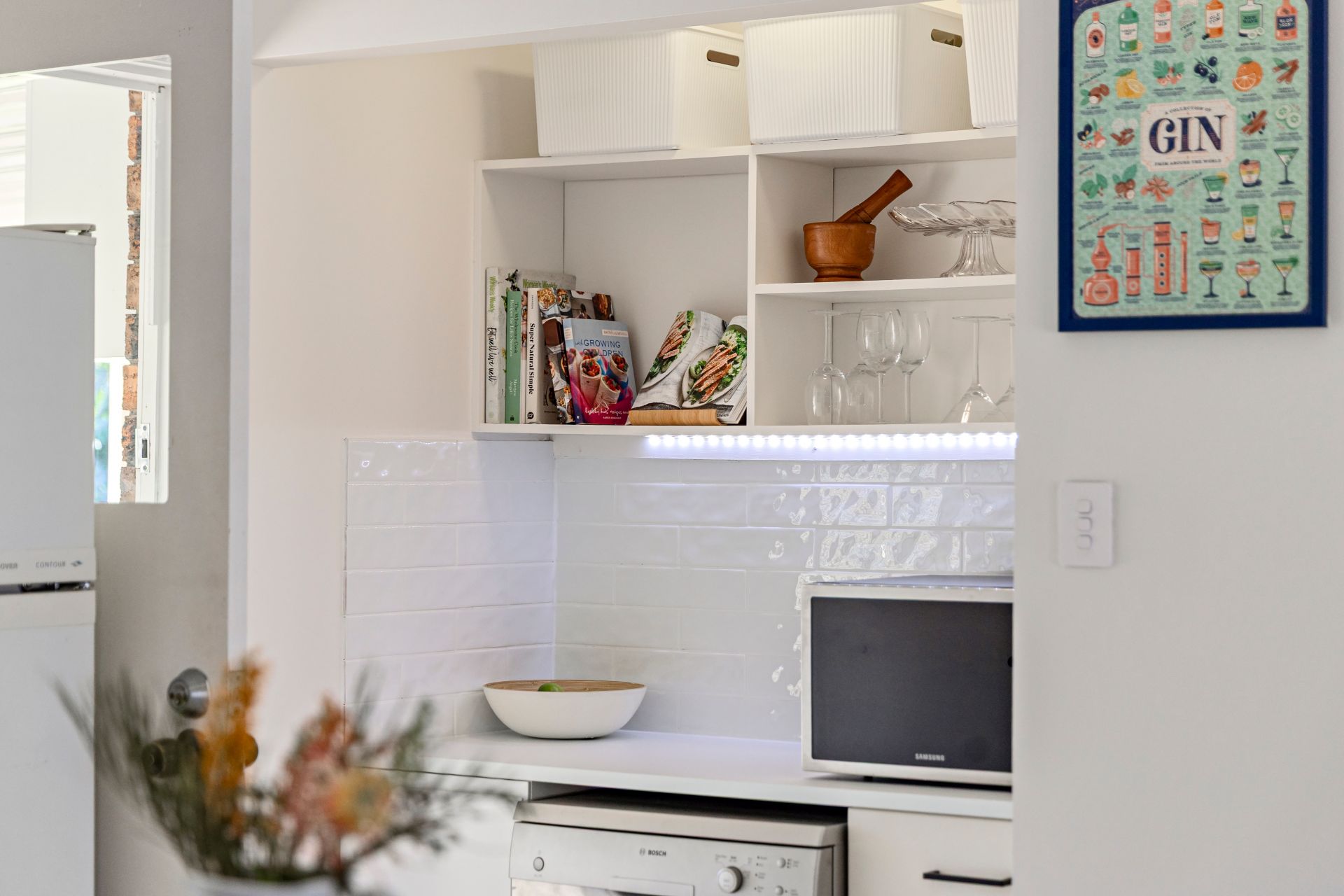 Full-sized kitchen with wrap-around benchtops, ample cabinetry, dishwasher, and a clever multi-use nook that can serve as a coffee station, appliance hub, or laundry area with added bench space and shelving.