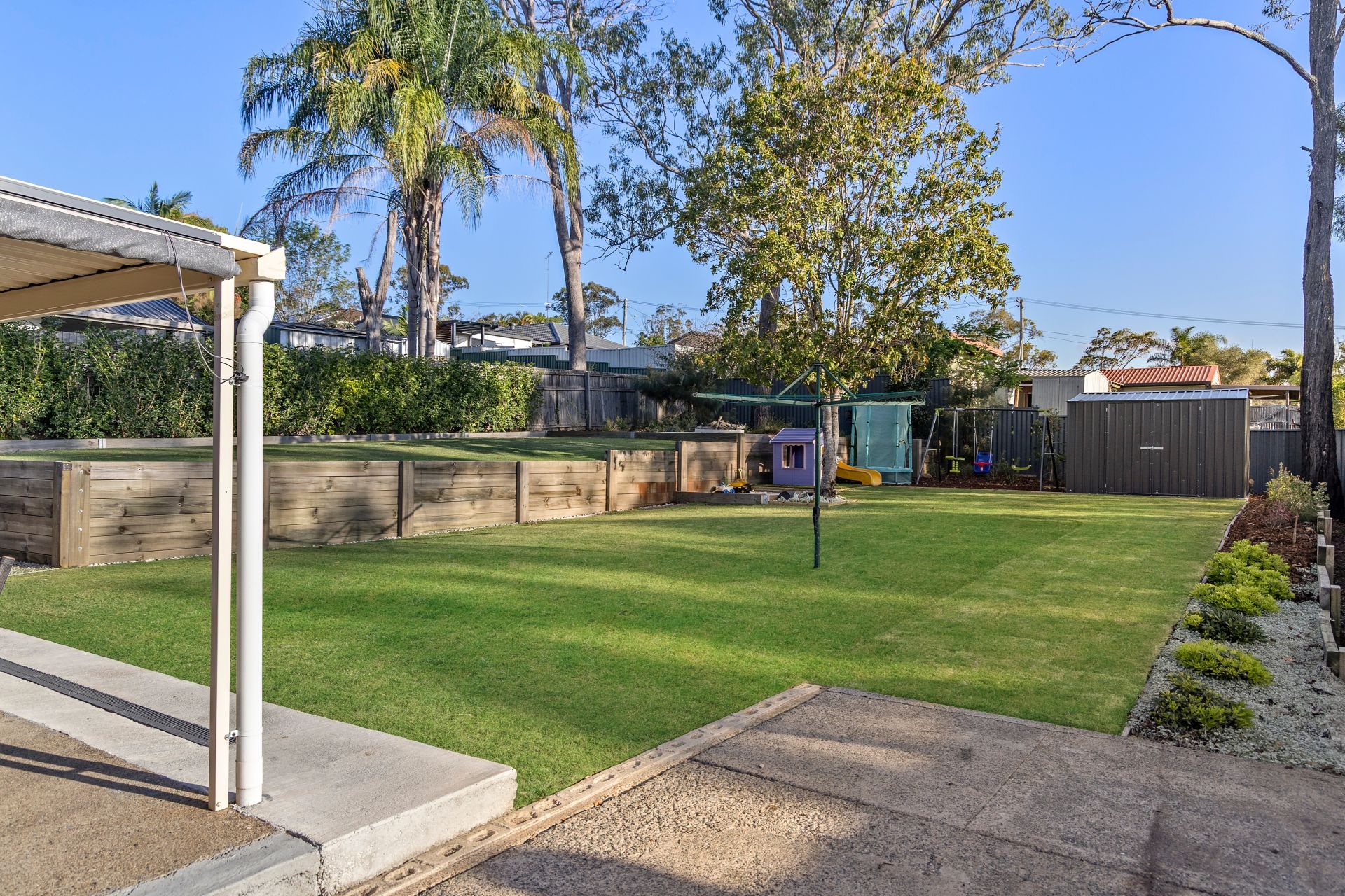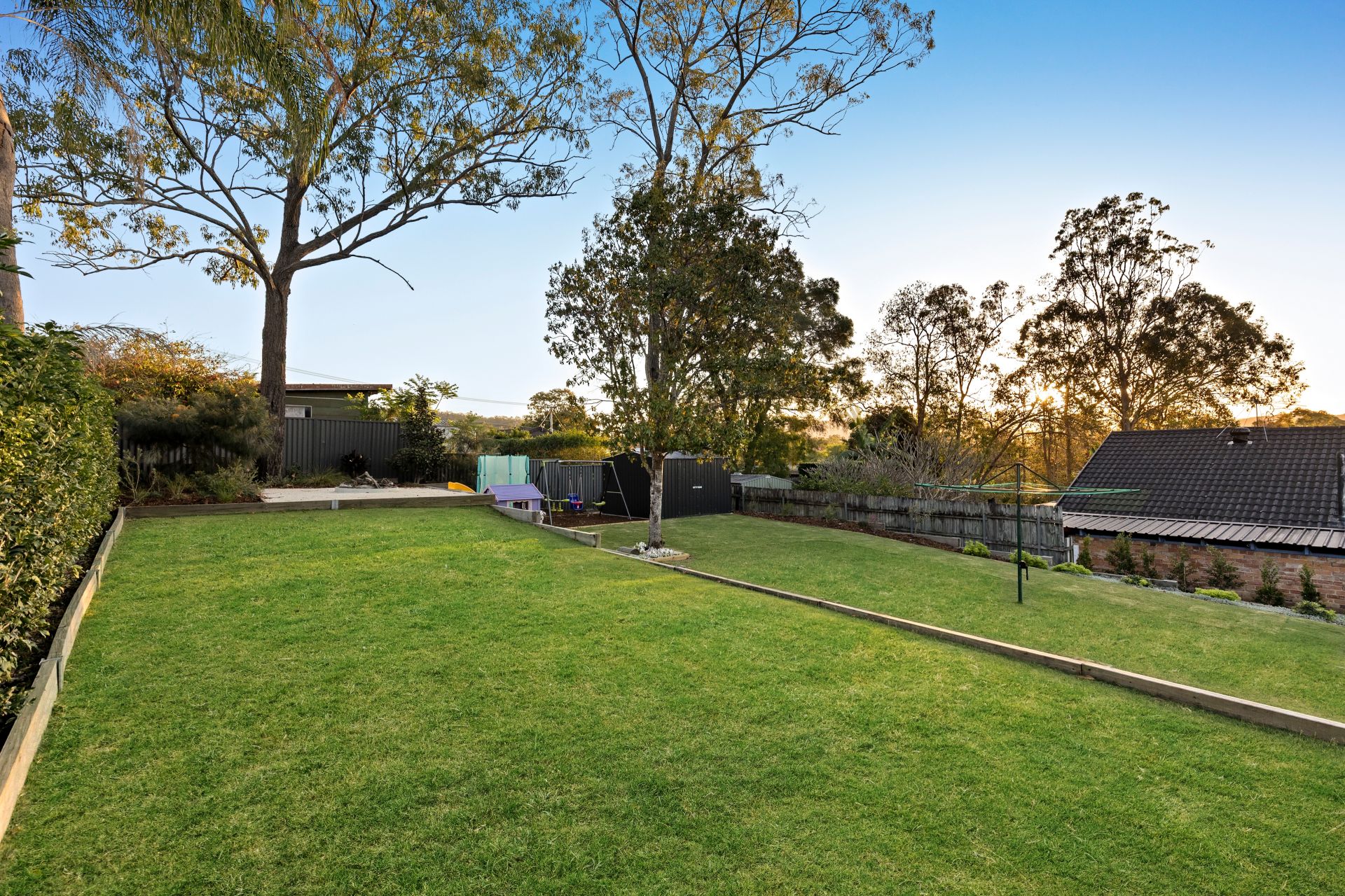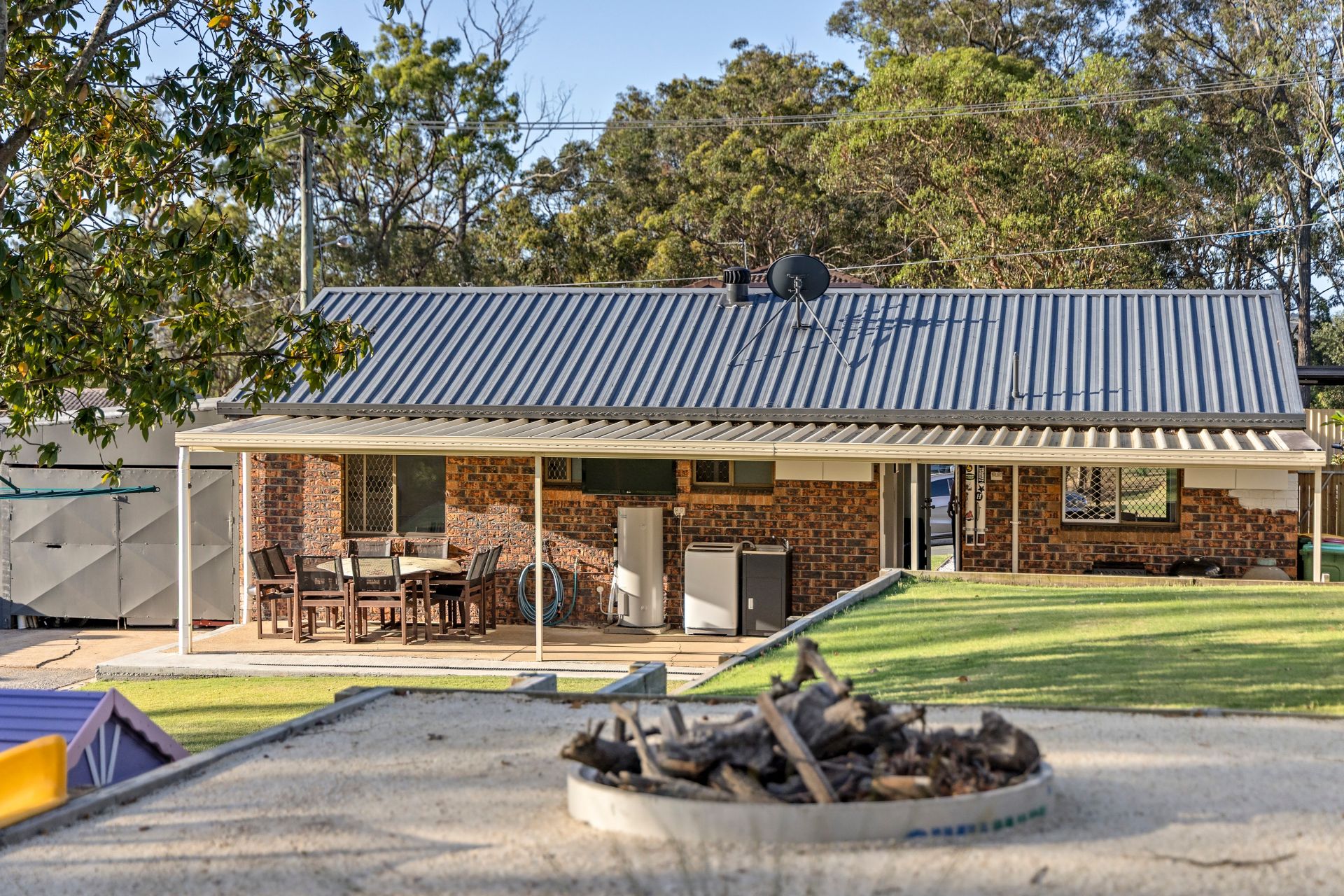 A huge Colorbond alfresco area stretches the full length of the home, overlooking beautifully maintained gardens crafted by a professional landscaper. The backyard offers an elevated firepit area, children’s play zone with sandpit, garden shed, and established native trees attracting vibrant birdlife.