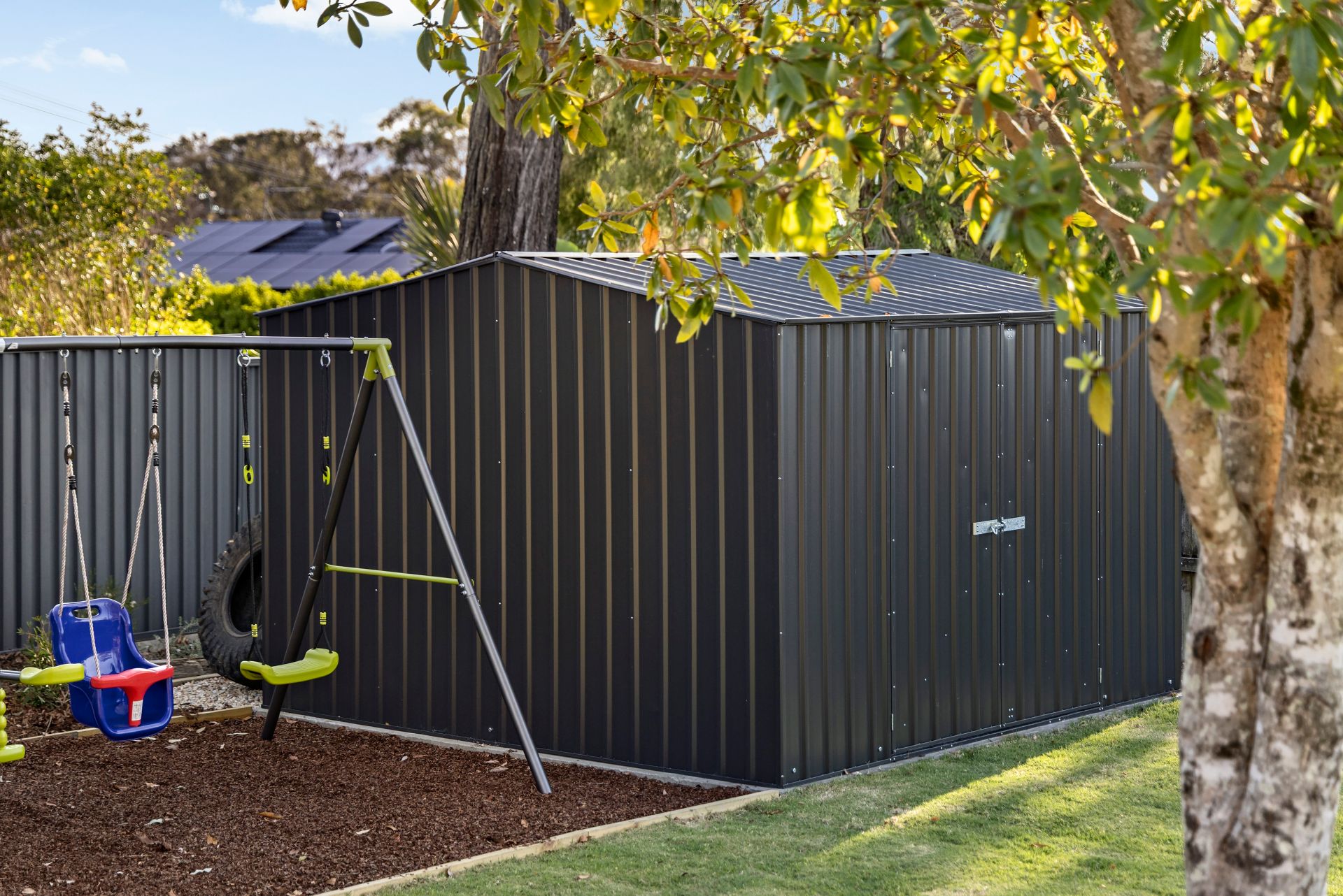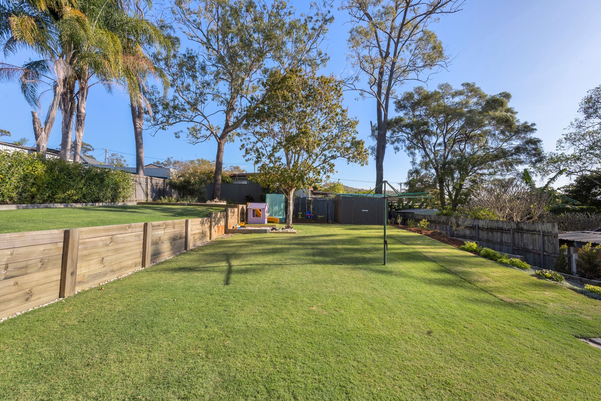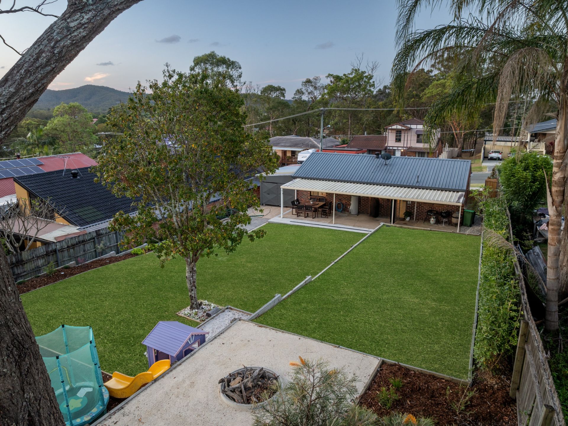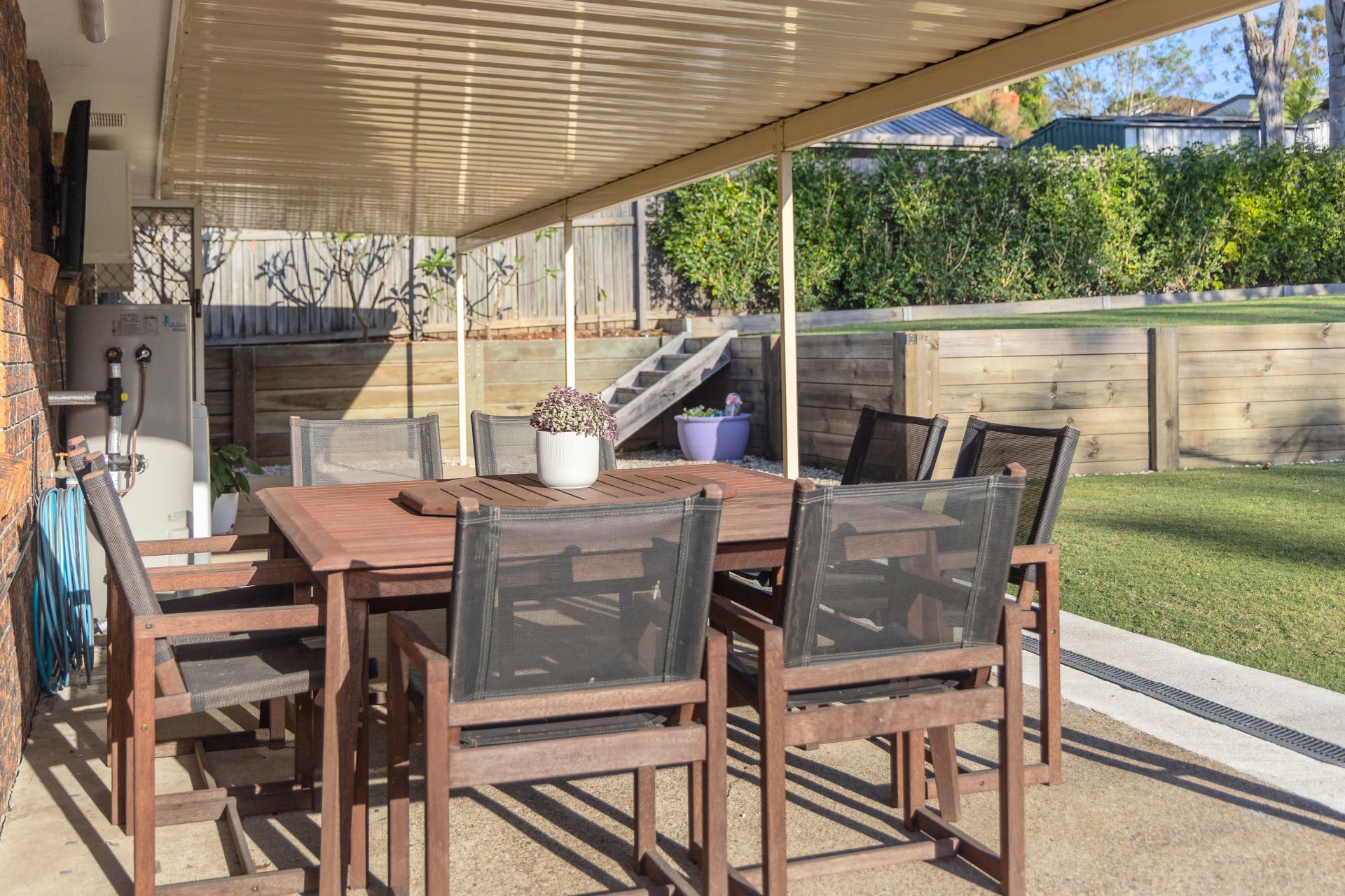 A huge Colorbond alfresco area stretches the full length of the home, overlooking beautifully maintained gardens crafted by a professional landscaper. The backyard offers an elevated firepit area, children’s play zone with sandpit, garden shed, and established native trees attracting vibrant birdlife.