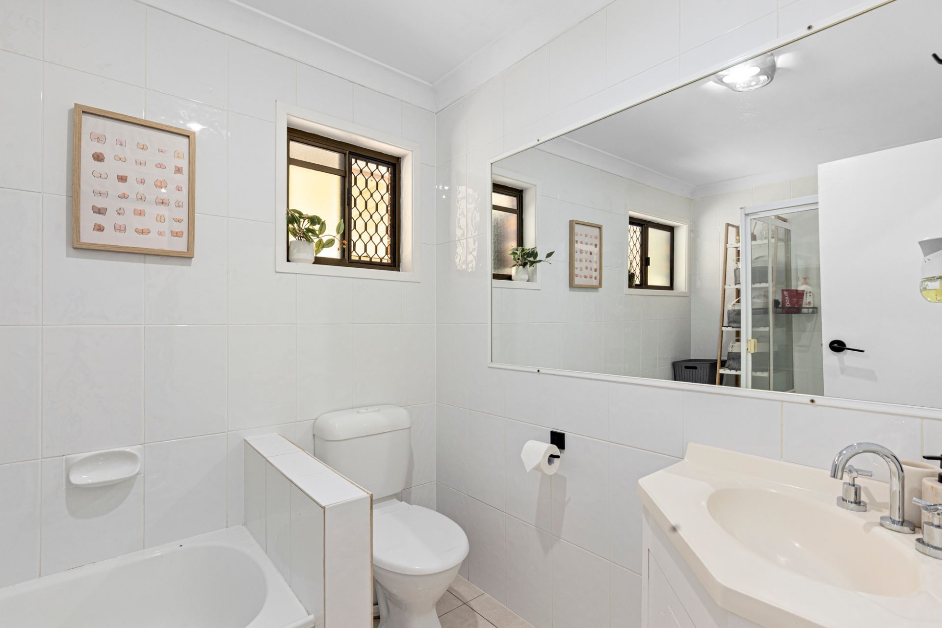 Two comfortable bedrooms are serviced by a well-appointed main bathroom featuring a large shower, full-sized kids’ bathtub, and practical layout for everyday ease.