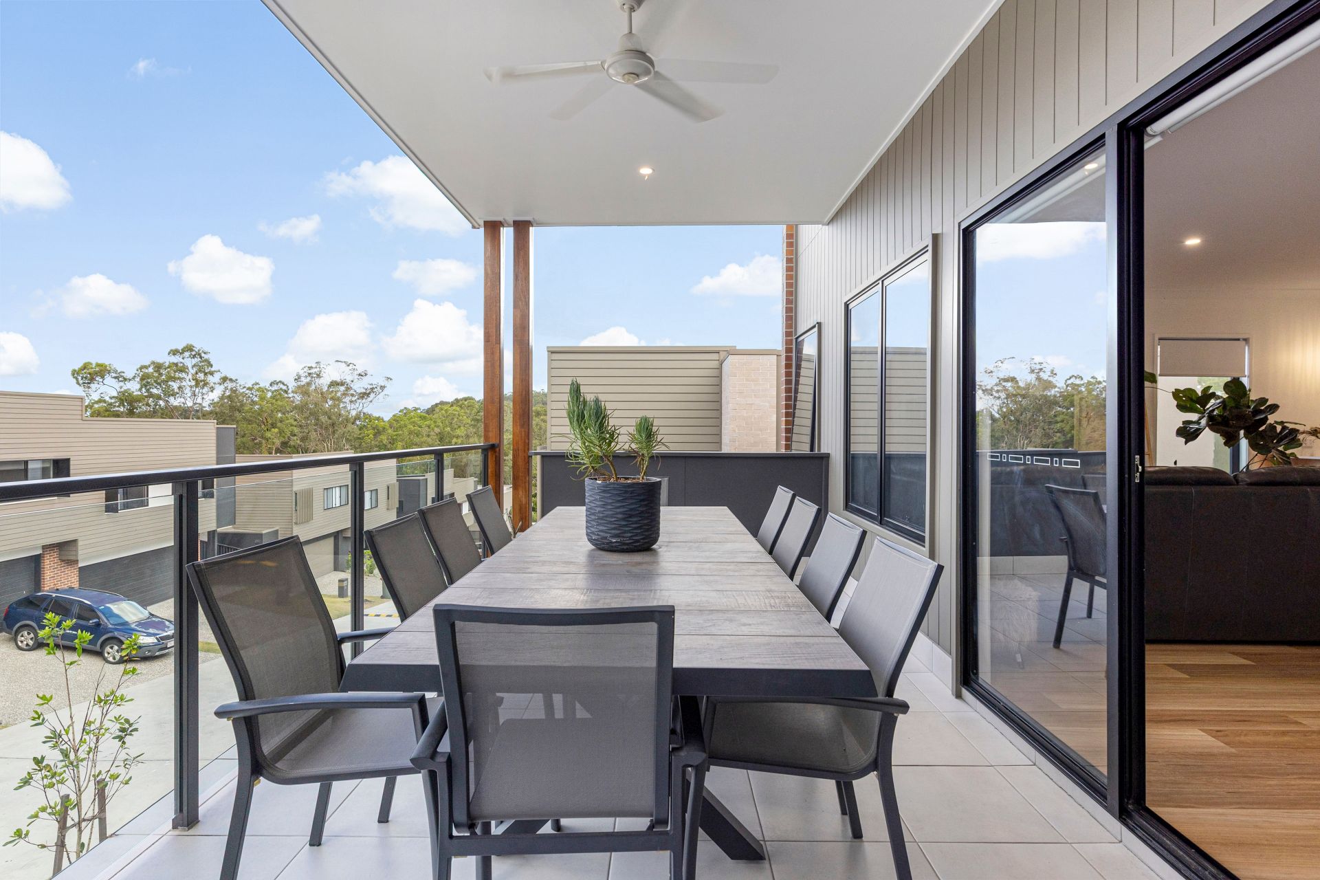 The thoughtful layout offers three bedrooms and a main bathroom downstairs, creating separation and privacy, while the upper level is devoted to everyday living. Here, a generous master suite and open-plan kitchen, dining, and living spaces connect beautifully to a sunlit balcony, making it the ideal place to unwind or entertain amid hinterland breezes and leafy views.