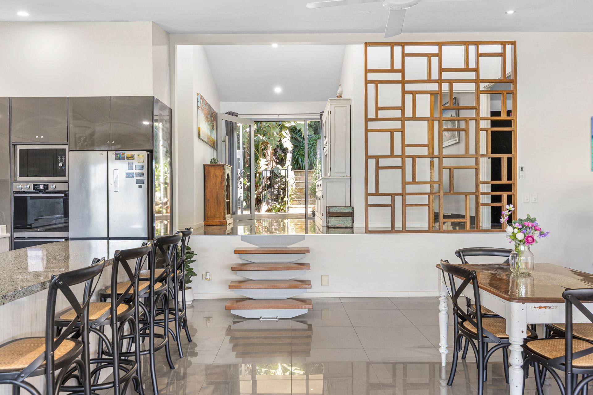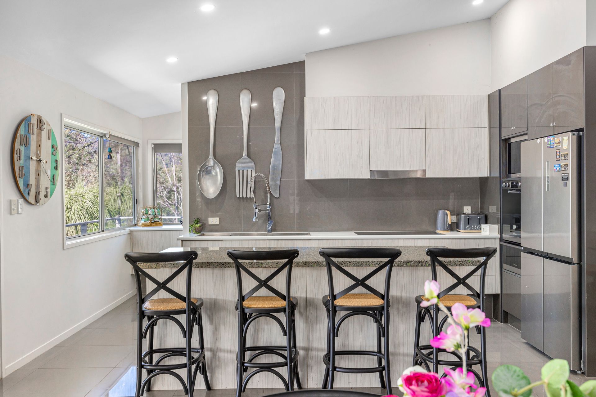 • Modern kitchen with stone benchtops, quality appliances, breakfast bar & huge walk-in butler’s pantry.