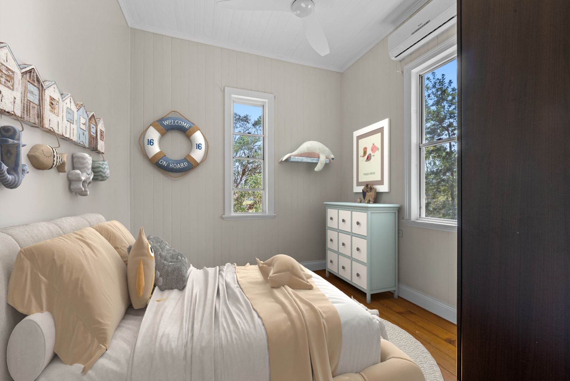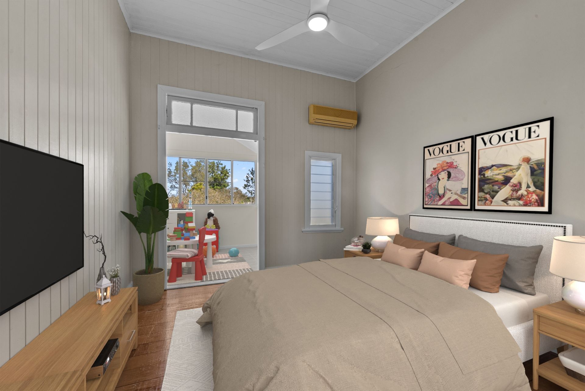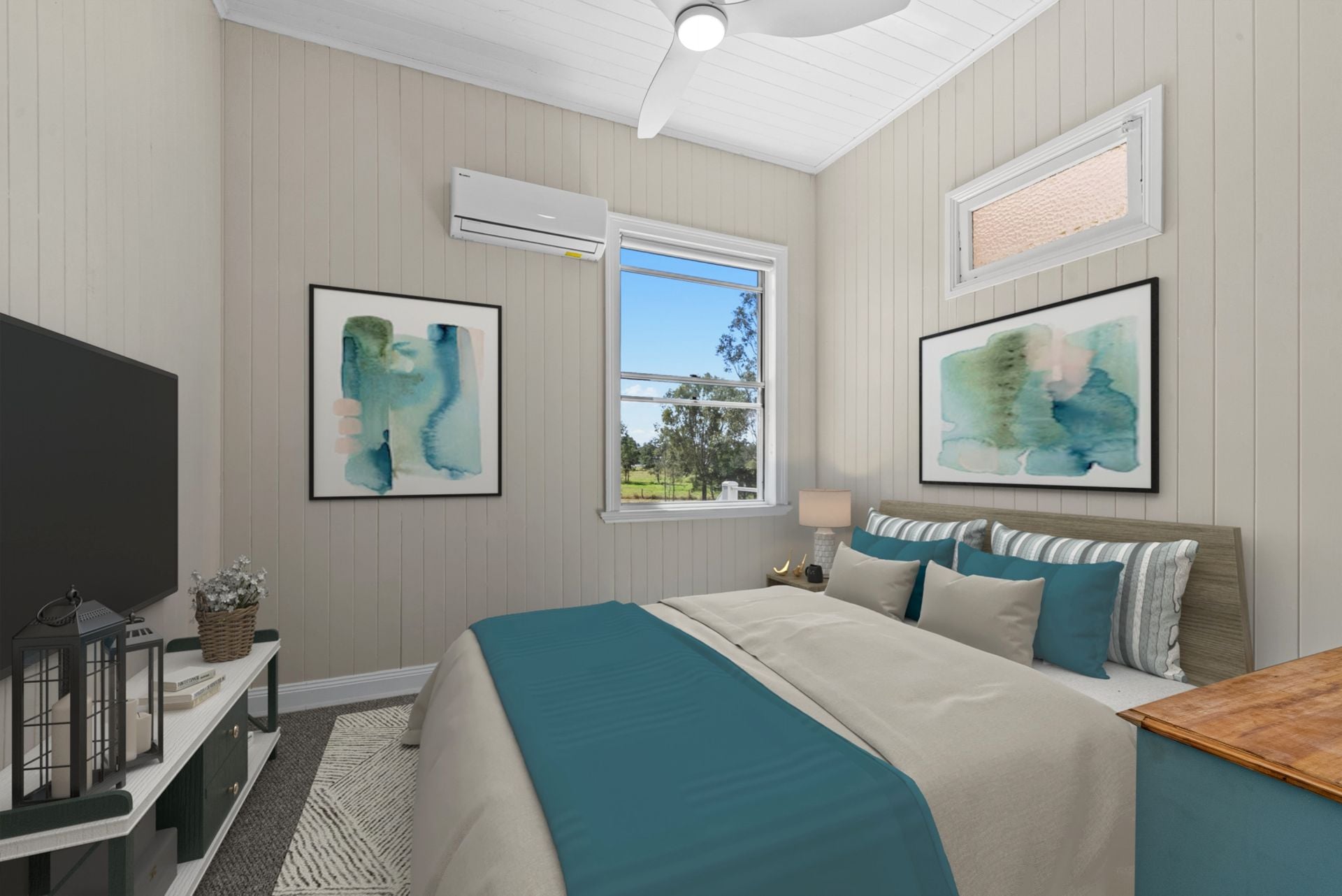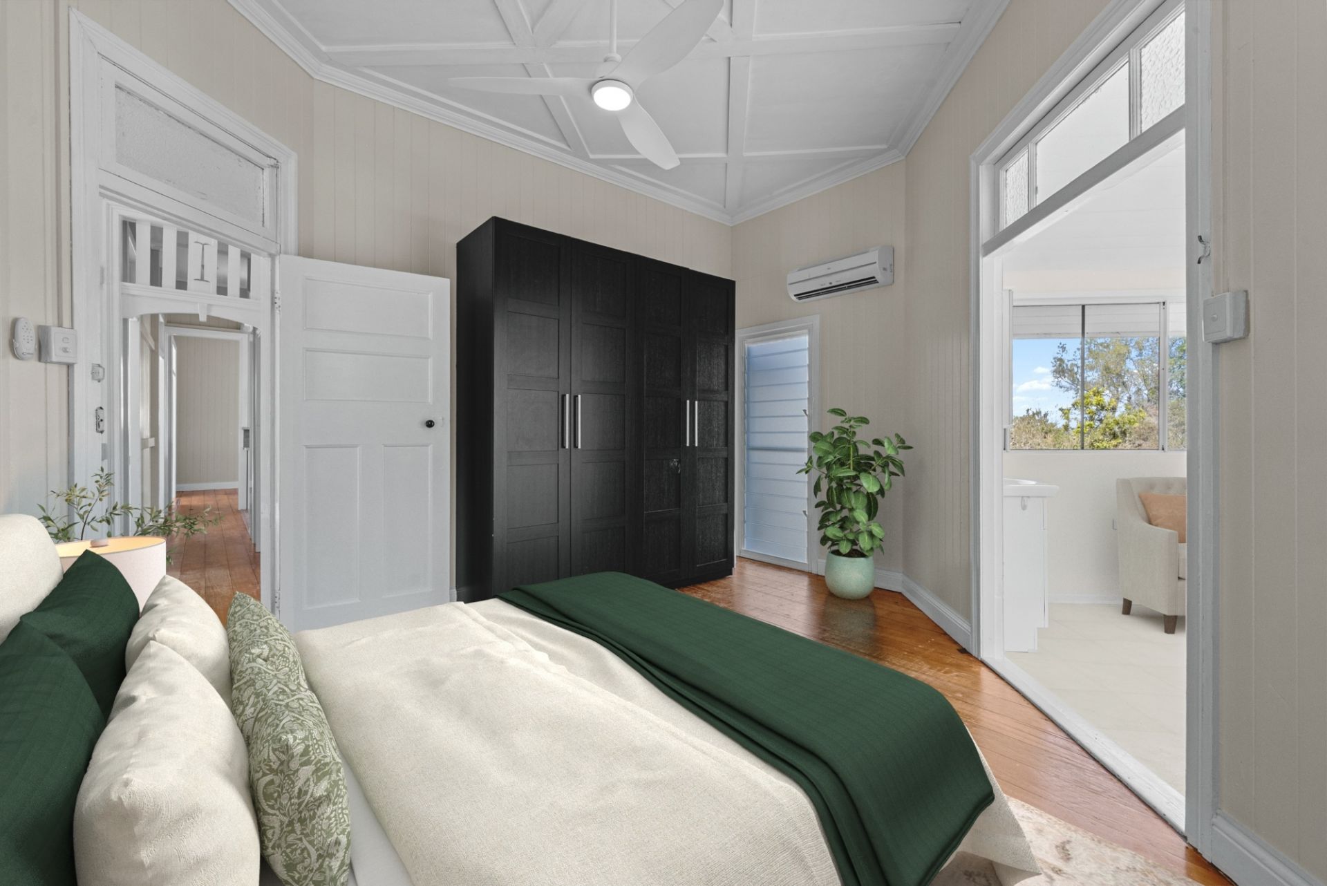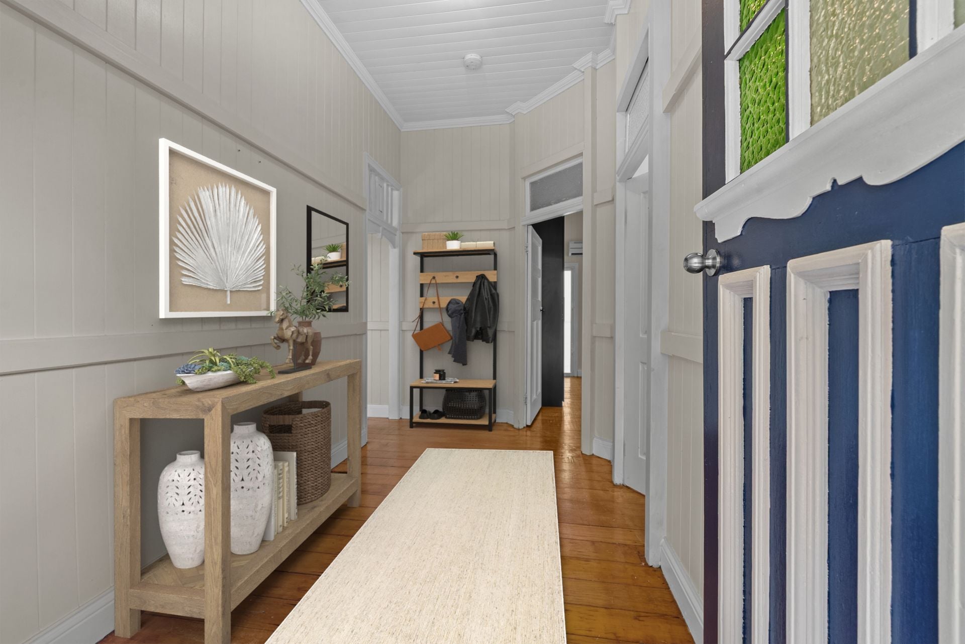 • Colonial-style design elements: Traditional internal tongue-and-groove VJ timber wall panelling, high ceilings, polished timber flooring, decorative timber framework, wide sash windows and a classic Colorbond roof pitched with wide eaves to provide shade and rain protection, central hallway with rooms branching off, common in symmetrical Queenslanders, French style doors to adjoining sunroom for a versatile floor plan